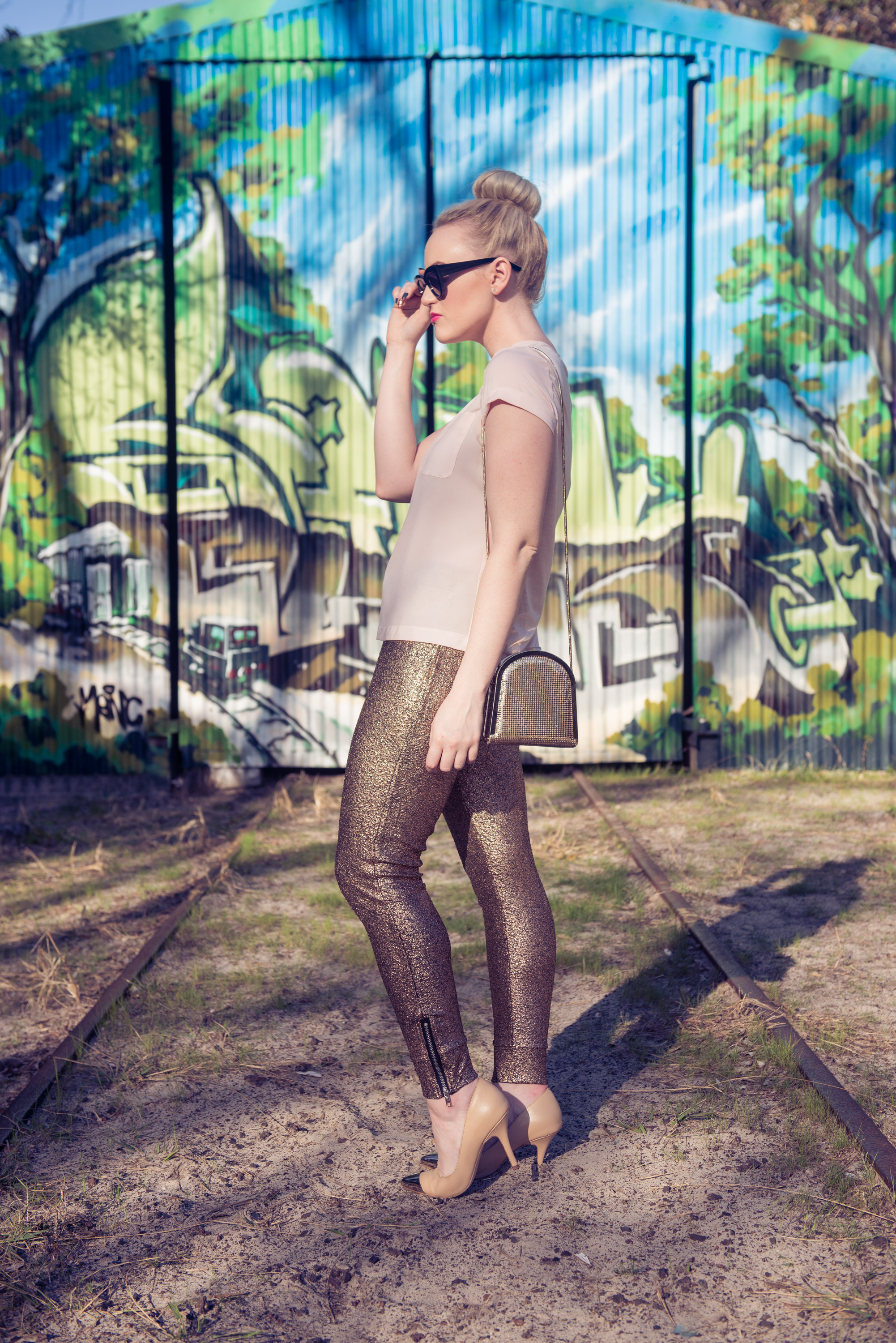 St Frock Gilded Metallic Joggers, French Connection Woven Front Top, House of Bourgeois Boom Boom Pave Ring, Sportsgirl Mistress Sunglasses, Jo Mercer Dita Heels, Oroton Scent Mesh Bag (similar style here).
