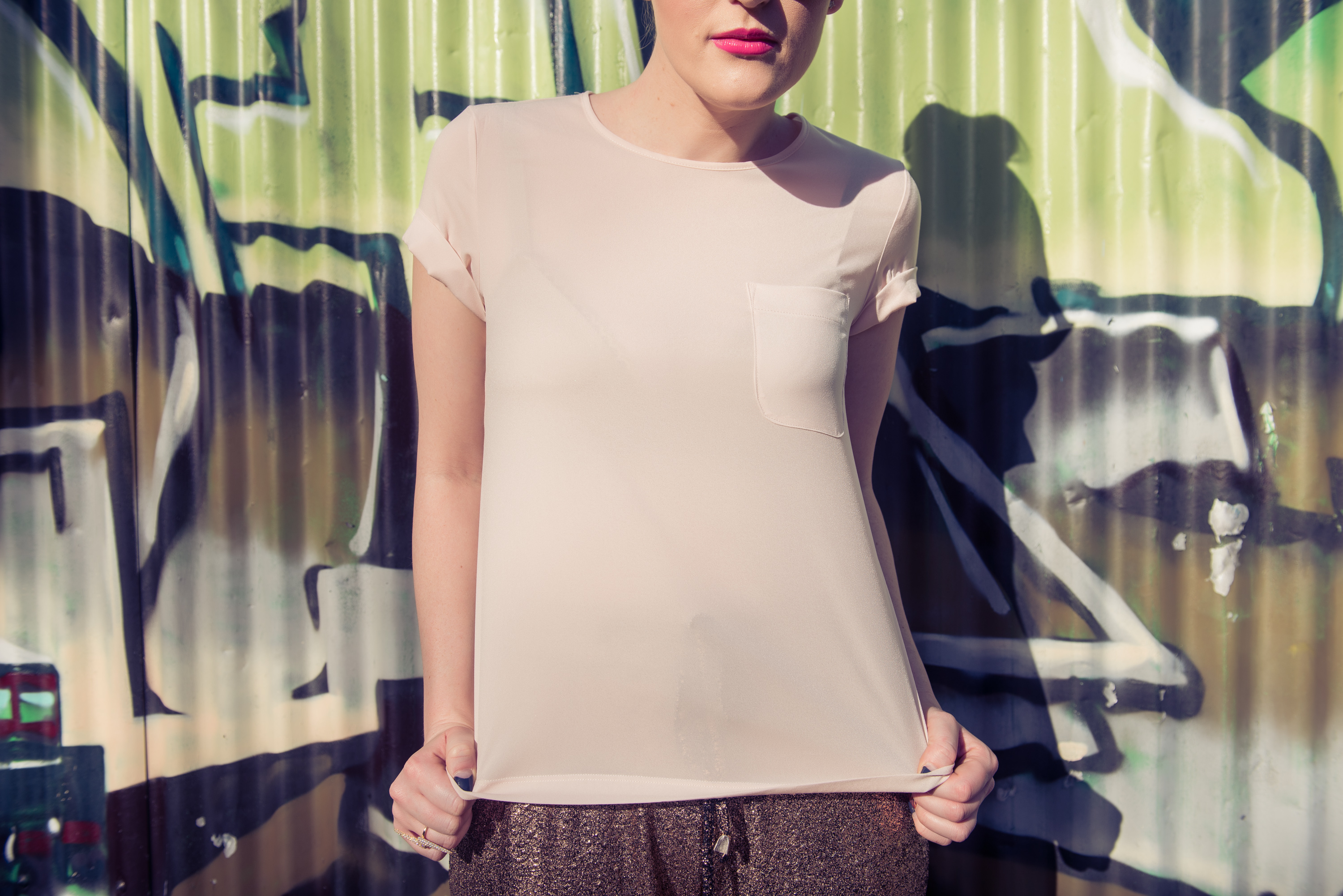 Proving you can never have too much sparkle in one outfit, I am clashing metals with gold and bronze with the help of St Frock’s Gilded Metallic Joggers. Super comfy and adding some serious wow factor to this look, these pants have become my golden ticket in the transition of winter to spring.