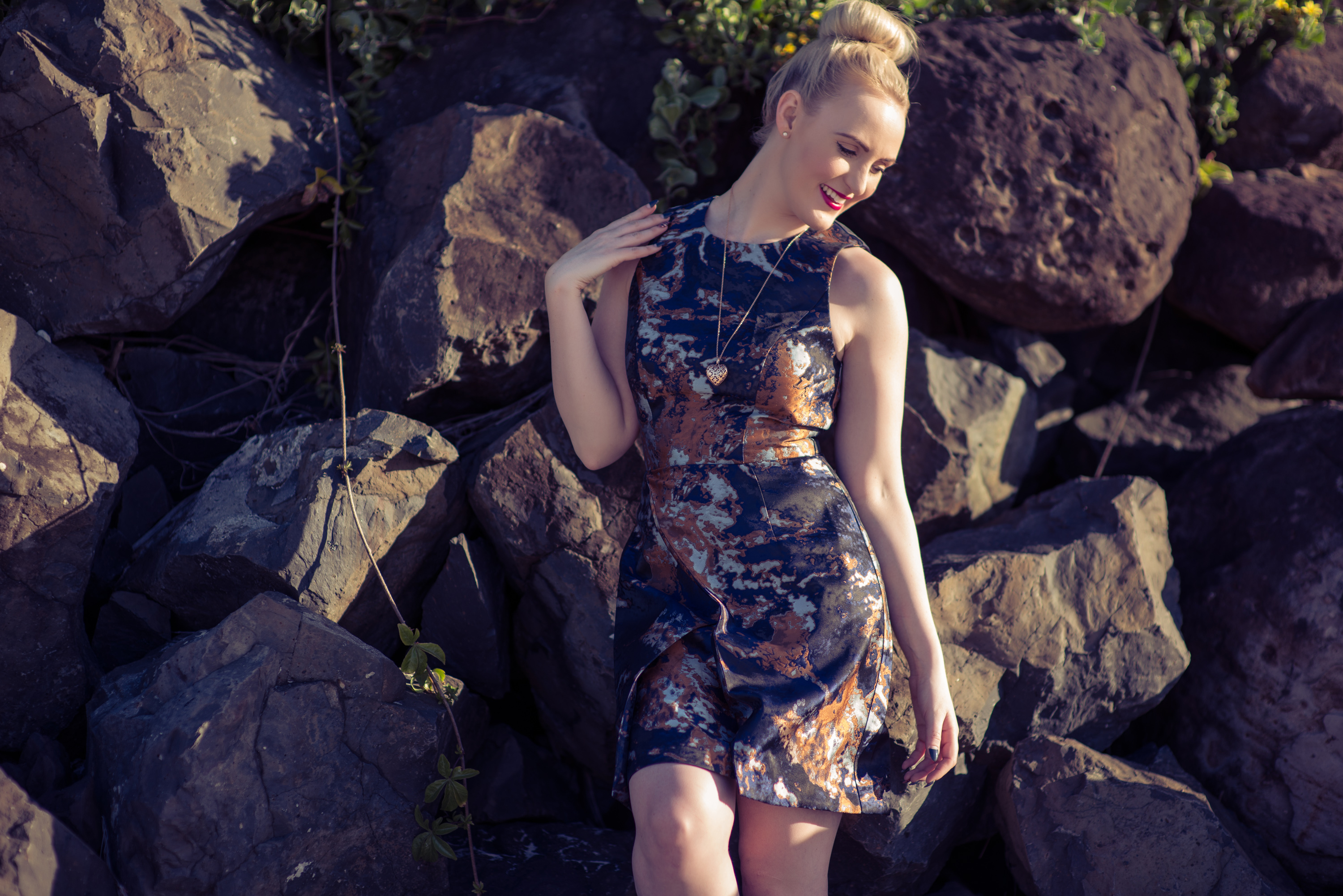 Cue In The City Wrap Skirt Jacquard Dress (available at DFO Jindalee), Thomas Sabo Heart Pendant (similar style here), Wittner Rose Gold Heels (similar style here).